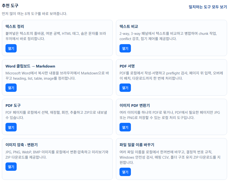 다른 하나는 컴플라이언스다. 개인 장난감으로 끝날 때는 대충 넘길 수 있는 것도, 업무 용도로 들어가는 순간부터는 설명이 필요해진다. -_-.. 데이터가 어디로 가는지, 남는지, 연동되는지, 누가 볼 수 있는지. 그런 질문은 대개 기능 명세보다 늦게 오지 않는다. 그래서 시작부터 브라우저 내 로컬 리소스만 활용하게끔 하는 특이한 구조로, 모든 도구를 만들었다. 내가 집에서 개발을 하고 광고를 붙여 수입을 올린다고 한들, 업무에 사용할 목적으로 만들었다면 적어도 변명거리가 되니 말이다.