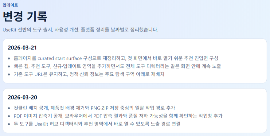 그래도 안 만들고는 몰랐을 것도 많았다. 짧다면 짧고 길다면 긴 그 2주 동안, 무엇을 앞에 둘 것인지, 무엇을 뒤로 물릴 것인지, 무엇이 실제로 통하는지, 무엇이 만드는 사람 입장에서만 그럴듯했는지를 꽤 많이 배웠다. 결국 UseKit은 앱을 많이 늘어놓는 곳이 아니라, 필요한 순간에 너무 오래 생각하지 않고 바로 써볼 수 있는 도구를 건네는 쪽이어야 했다.