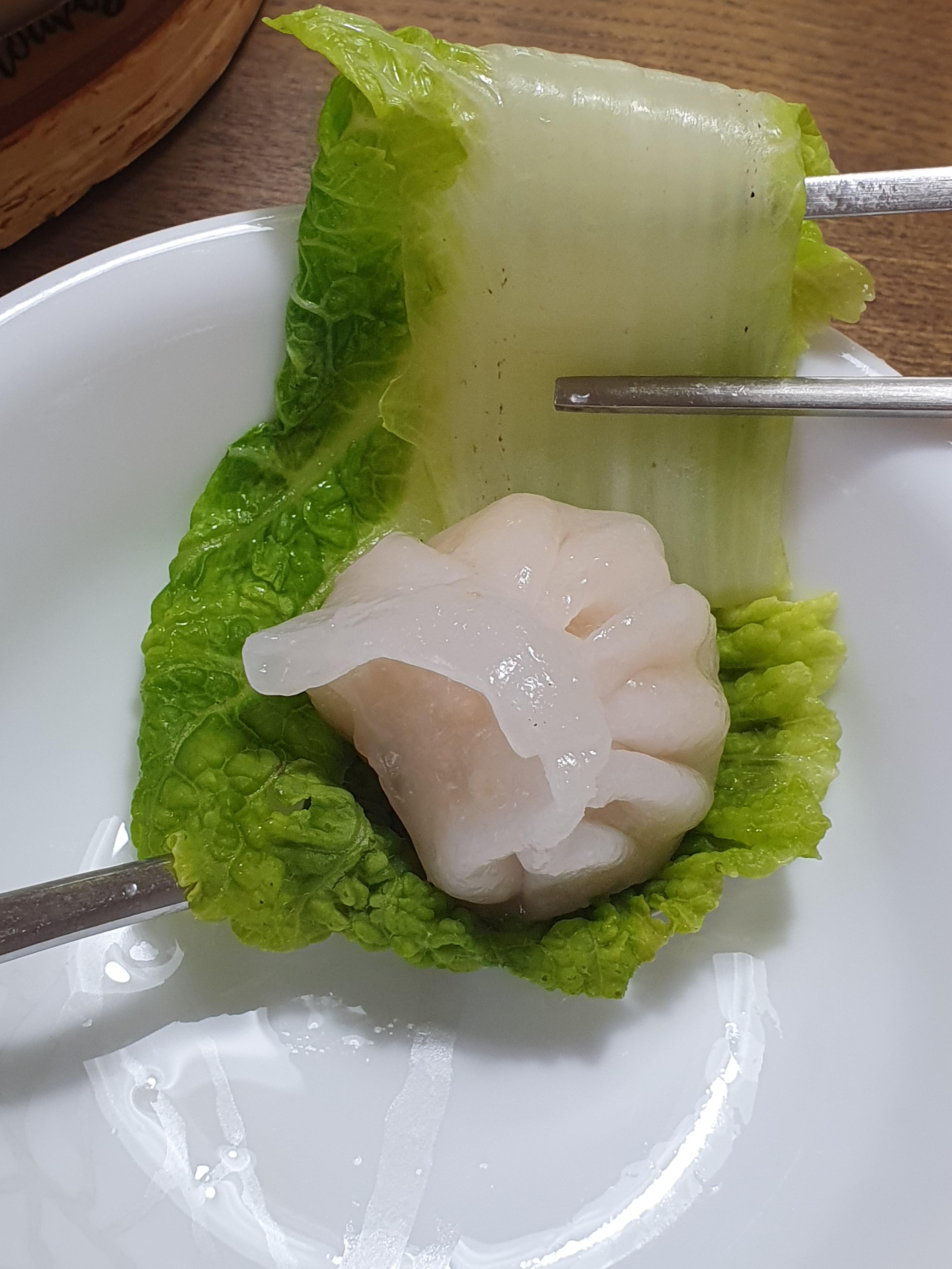 배추 쌈. 속이 비치는 하가우 위로 육즙이 맺힌다. 살짝 식초를 뿌리면, 배추의 단맛이 한층 선명해진다.